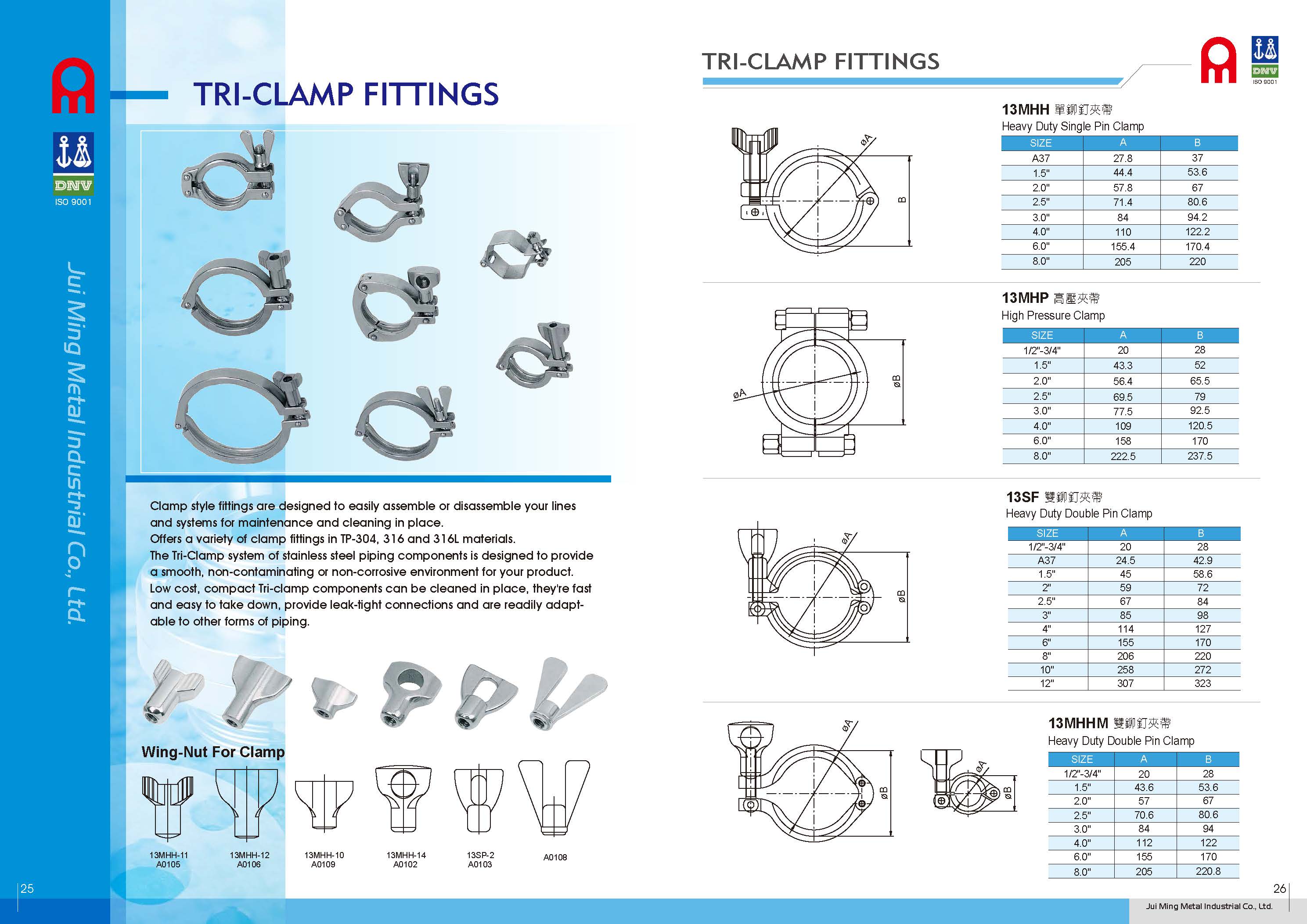 - Various clamp types we have as Below: 13MHH Single Pin Clamp, 13MHHM Double Pin Clamp, 13SF Double Pin Clamp , 13MHP High Pressure Clamp and 3-PC Clamp can be installing with regular type wing nut, you also can ask us for installing different wing nut according to your request.